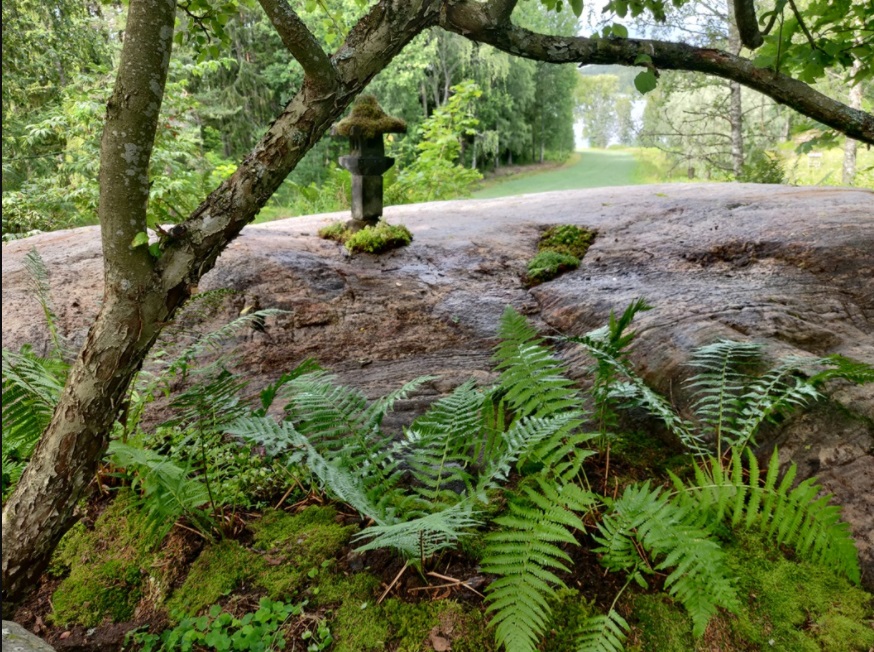 Kuvassa on yksityinen muisto- ja hiljentymispaikka luonnon helmassa. Saniaisia, sammalia ja maksaruohoja ja muita luonnonkasveja siirrettiin puun juurelle ja kalliolle.